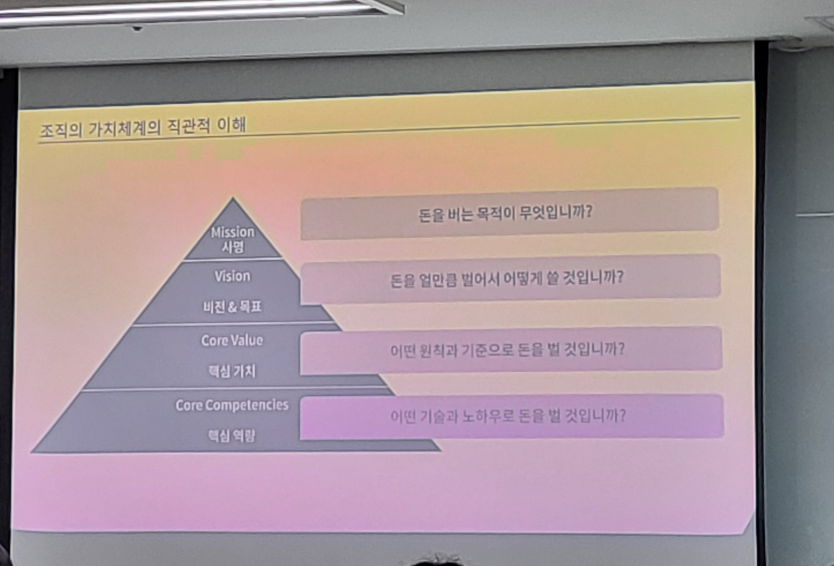 "조직의 존재 이유, 핵심가치, 핵심역량, 목표, 비전을 한눈에 담는 설계도"라고 설명했습니다.